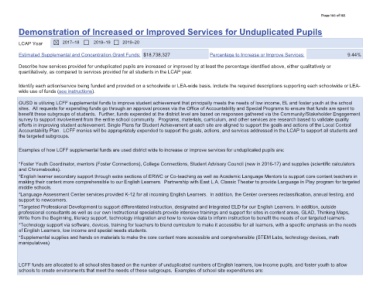'HVFULEH KRZ VHUYLFHV SURYLGHG IRU XQGXSOLFDWHG SXSLOV DUH LQFUHDVHG RU LPSURYHG E\ DW OHDVW WKH SHUFHQWDJH LGHQWLILHG DERYH  HLWKHU TXDOLWDWLYHO\ RU  ,GHQWLI\ HDFK DFWLRQ VHUYLFH EHLQJ IXQGHG DQG SURYLGHG RQ D VFKRROZLGH RU /($ ZLGH EDVLV  ,QFOXGH WKH UHTXLUHG GHVFULSWLRQV VXSSRUWLQJ HDFK VFKRROZLGH RU /($  286' LV XWLOL]LQJ /&)) VXSSOHPHQWDO IXQGV WR LPSURYH VWXGHQW DFKLHYHPHQW WKDW SULQFLSDOO\ PHHWV WKH QHHGV RI ORZ LQFRPH  (/ DQG IRVWHU \RXWK