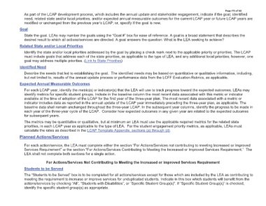 Page 173 of 182 $V SDUW RI WKH /&$3 GHYHORSPHQW SURFHVV ZKLFK LQFOXGHV WKH DQQXDO XSGDWH DQG VWDNHKROGHU HQJDJHPHQW LQGLFDWH LI WKH JRDO LGHQWLILHG QHHG UHODWHG VWDWH DQG RU ORFDO SULRULWLHV DQG RU H[SHFWHG DQQXDO PHDVXUDEOH RXWFRPHV IRU WKH FXUUHQW /&$3 \HDU RU IXWXUH /&$3 \HDUV DUH 6WDWH WKH JRDO /($V PD\ QXPEHU WKH JRDOV XVLQJ WKH ³*RDO ´ ER[ IRU HDVH RI UHIHUHQFH $ JRDO LV D EURDG VWDWHPHQW WKDW GHVFULEHV WKH ,GHQWLI\ WKH VWDWH DQG RU ORFDO SULRULWLHV DGGUHVVHG