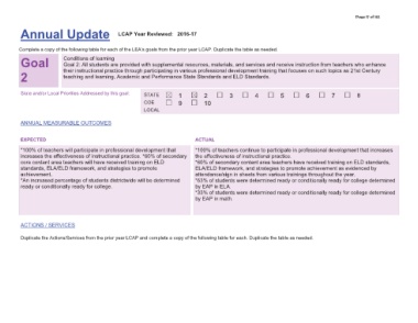 $QQXDO 8SGDWH &RQGLWLRQV RI OHDUQLQJ 6WDWH DQG RU /RFDO 3ULRULWLHV $GGUHVVHG E\ WKLV JRDO $118$/ 0($685$%/( 287&20(6 RI WHDFKHUV ZLOO SDUWLFLSDWH LQ SURIHVVLRQDO GHYHORSPHQW WKDW LQFUHDVHV WKH HIIHFWLYHQHVV RI LQVWUXFWLRQDO SUDFWLFH RI VHFRQGDU\ FRUH FRQWHQW DUHD WHDFKHUV ZLOO KDYH UHFHLYHG WUDLQLQJ RQ (/' VWDQGDUGV (/$ (/' IUDPHZRUN DQG VWUDWHJLHV WR SURPRWH $Q LQFUHDVHG SHUFHQWDJH RI VWXGHQWV GLVWULFWZLGH ZLOO EH GHWHUPLQHG UH