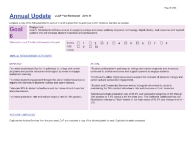 $QQXDO 8SGDWH (QJDJHPHQW 6WDWH DQG RU /RFDO 3ULRULWLHV $GGUHVVHG E\ WKLV JRDO $118$/ 0($685$%/( 287&20(6 ,QFUHDVH VWXGHQW SDUWLFLSDWLRQ LQ SDWKZD\V WR FROOHJH DQG FDUHHU SURJUDPV DQG SURYLGH UHVRXUFHV DQG VXSSRUW V\VWHPV WR HQJDJH VWXGHQWV LQ OHDUQLQJ ,QFUHDVH VWXGHQW HQJDJHPHQW WKURXJK WKH XVH RI GLJLWDO UHVRXUFHV WR H[SDQG WKH LQWHUHVWV RI VWXGHQWV¶ FROOHJH DQG FDUHHU RSWLRQV 0DLQWDLQ LQ VWXGHQW DWWHQGDQFH DQG GHFUHDVH FKURQLF WUXD