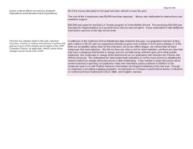 Page 59 of 182 7KH FRVW RI WKH HPSOR\HHV ZDV OHVV WKDQ H[SHFWHG 0RQH\ ZDV UHDOORFDWHG WR LQWHUYHQWLRQV DQG ZDV VSHQW IRU WKH (DVW /$ 7KHDWHU SURJUDP DW <RUED 0LGGOH 6FKRRO 7KH UHPDLQLQJ ZDV DOORFDWHG IRU LPSOHPHQWDWLRQ DW D VHFRQG VFKRRO VLWH EXW ZDV QRW VSHQW ,W ZDV UHDOORFDWHG WR DGG DGGLWLRQDO ,Q UHIOHFWLRQ RI WKH &DOLIRUQLD 6FKRRO 'DVKERDUG GDWD UHODWHG WR WKLV JRDO RXU JUDGXDWLRQ LQGLFDWRU LV EOXH ZLWK D VWDWXV RI DQG RXU VXVSHQ