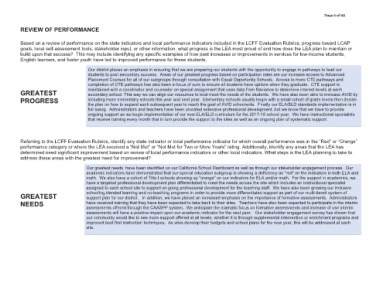 5(9,(: 2) 3(5)250$1&( %DVHG RQ D UHYLHZ RI SHUIRUPDQFH RQ WKH VWDWH LQGLFDWRUV DQG ORFDO SHUIRUPDQFH LQGLFDWRUV LQFOXGHG LQ WKH /&)) (YDOXDWLRQ 5XEULFV SURJUHVV WRZDUG /&$3 JRDOV ORFDO VHOI DVVHVVPHQW WRROV VWDNHKROGHU LQSXW RU RWKHU LQIRUPDWLRQ ZKDW SURJUHVV LV WKH /($ PRVW SURXG RI DQG KRZ GRHV WKH /($ SODQ WR PDLQWDLQ RU EXLOG XSRQ WKDW VXFFHVV" 7KLV PD\ LQFOXGH LGHQWLI\LQJ DQ\ VSHFLILF H[DPSOHV RI KRZ SDVW LQFUHDVHV RU LPSURYHPHQWV LQ VHUYLFHV IRU ORZ LQFR
