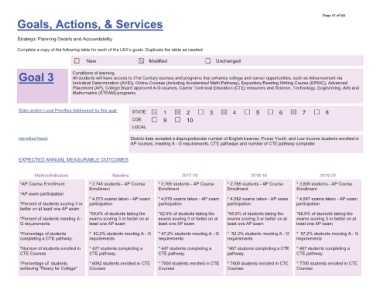 *RDO ,GHQWLILHG 1HHG 0HWULFV ,QGLFDWRUV $3 &RXUVH (QUROOPHQW $3 H[DP SDUWLFLSDWLRQ 3HUFHQW RI VWXGHQWV VFRULQJ RU EHWWHU RQ DW OHDVW RQH $3 H[DP 3HUFHQW RI VWXGHQWV PHHWLQJ $ * UHTXLUHPHQWV 3HUFHQWDJH RI VWXGHQWV FRPSOHWLQJ D &7( SDWKZD\ 1XPEHU RI VWXGHQWV HQUROOHG LQ &7( &RXUVHV 3HUFHQWDJH RI VWXGHQWV DFKLHYLQJ 5HDG\ IRU &ROOHJH