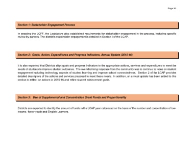 In enacting the LCFF, the Legislature also established requirements for stakeholder engagement in the process, including specific review by parents. The district’s stakeholder engagement is detailed in Section I of the LCAP. Section 2: Goals, Action, Expenditures and Progress Indicators, Annual Update (2015-16) It is also expected that Districts align goals and progress indicators to the appropriate actions, services and expenditures to meet the need