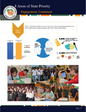 8 Areas of State Priority Engagement, Continued Goal 7: All students will have access to resources, services and programs that provide a safe and motivating learning experience that fosters school connectedness. School Climate Page | 15