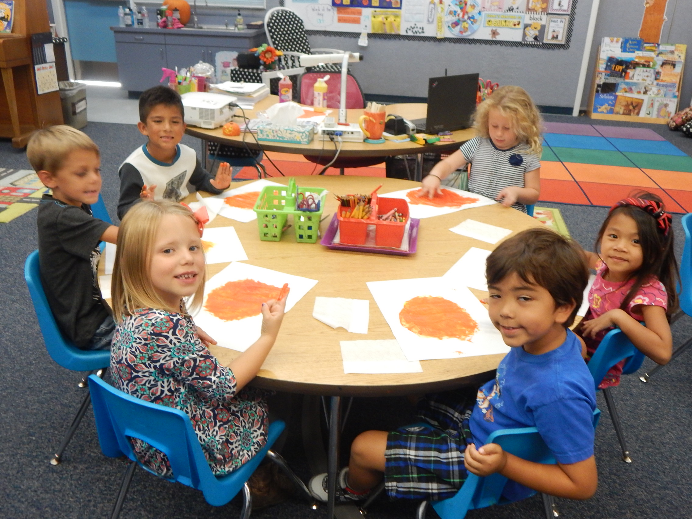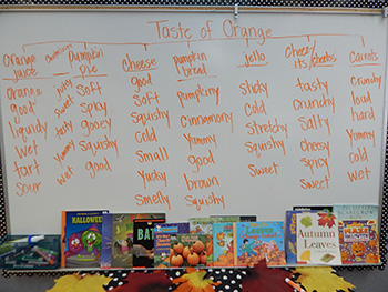 Thank you Moms and Dads for all the great donations, it was a very successful sensory event. Here are a few pictures of the kids using their senses and coming up with adjectives that described the ways each item looked, smelled, tasted like, looked like, and sounded like. We had a really fun time exploring orange foods!