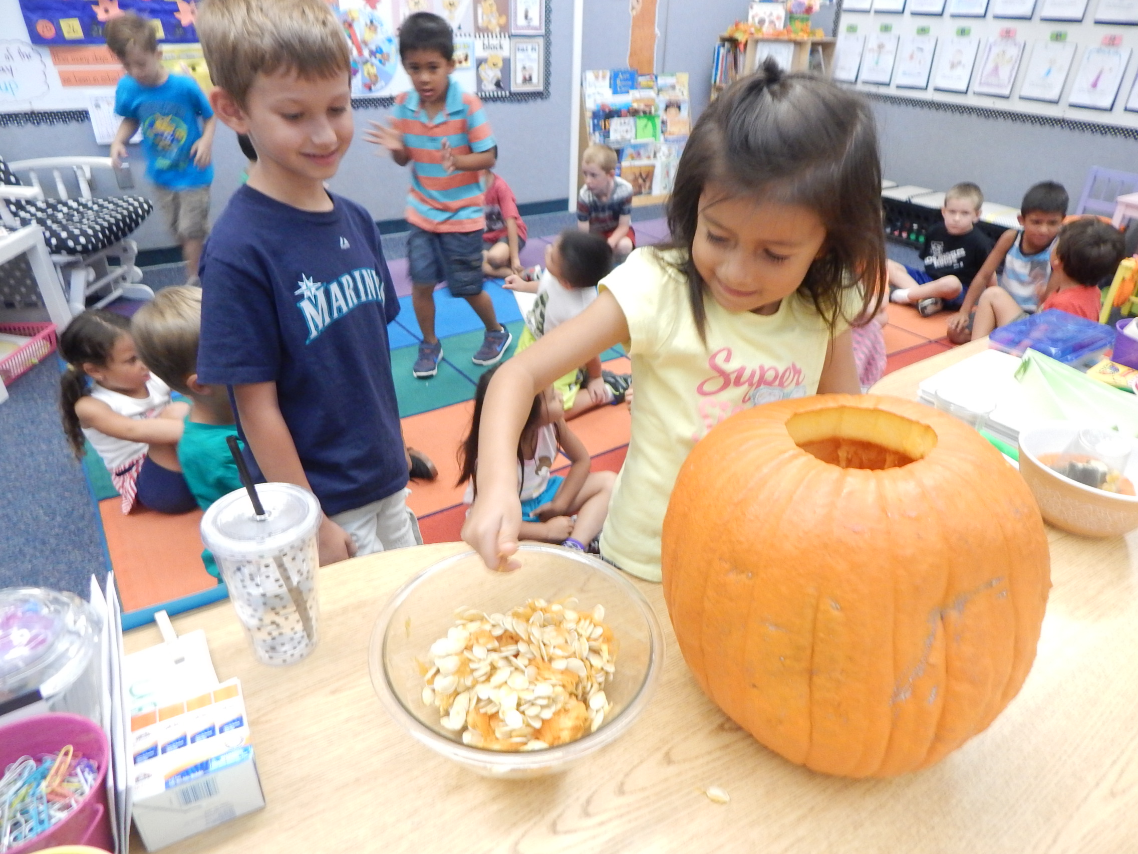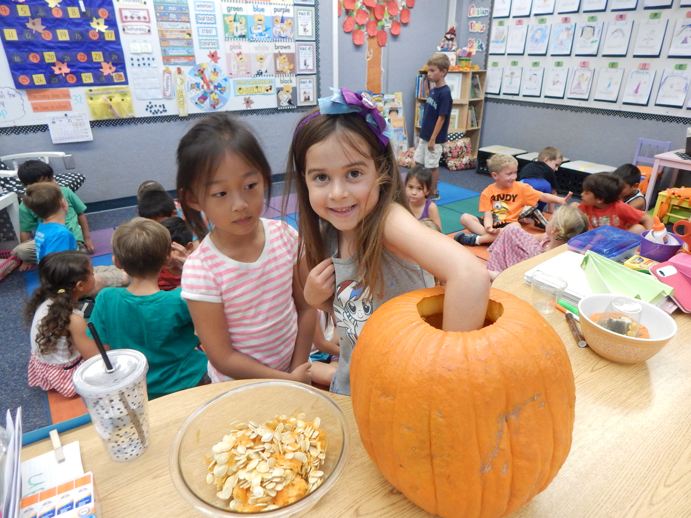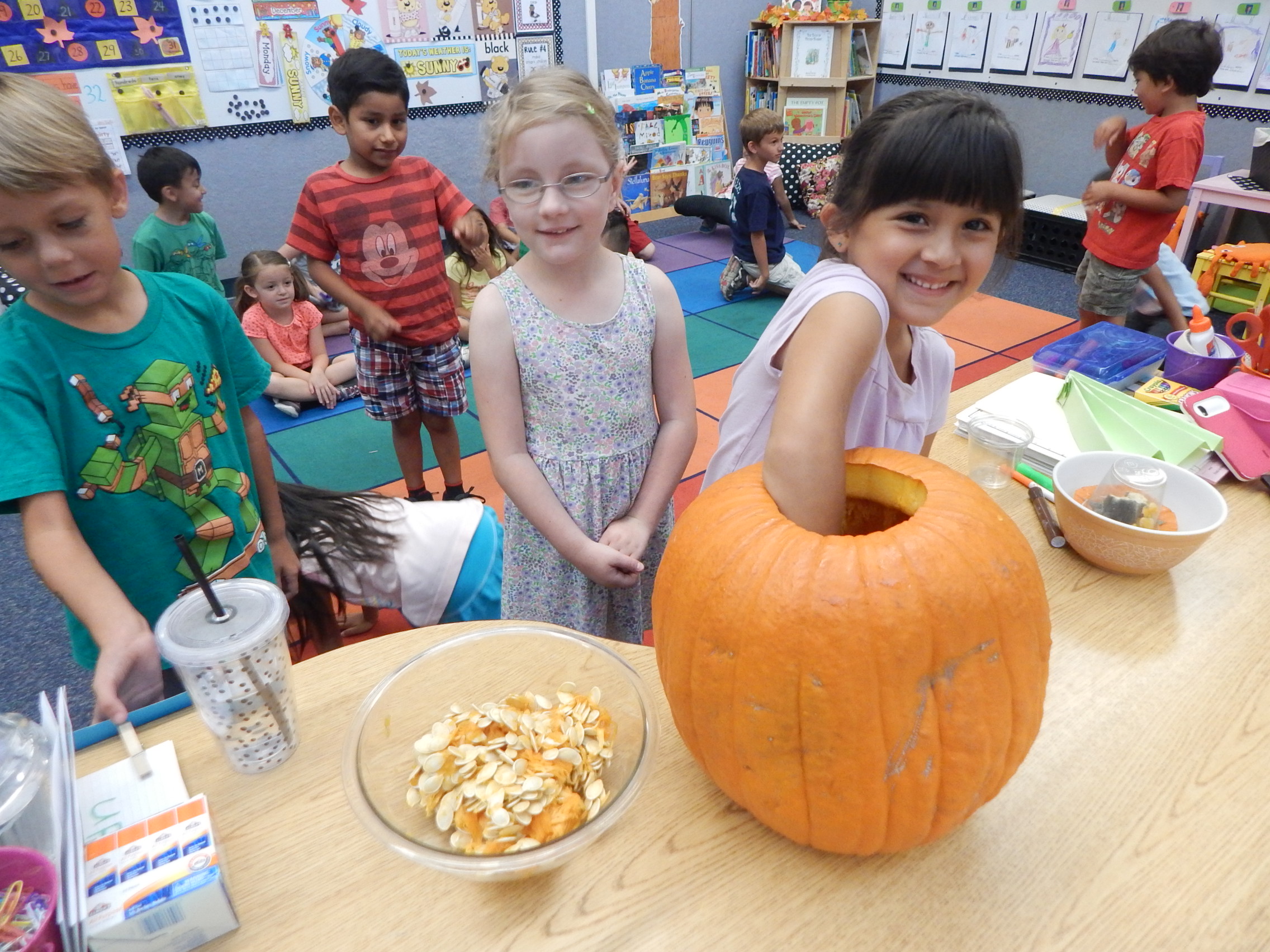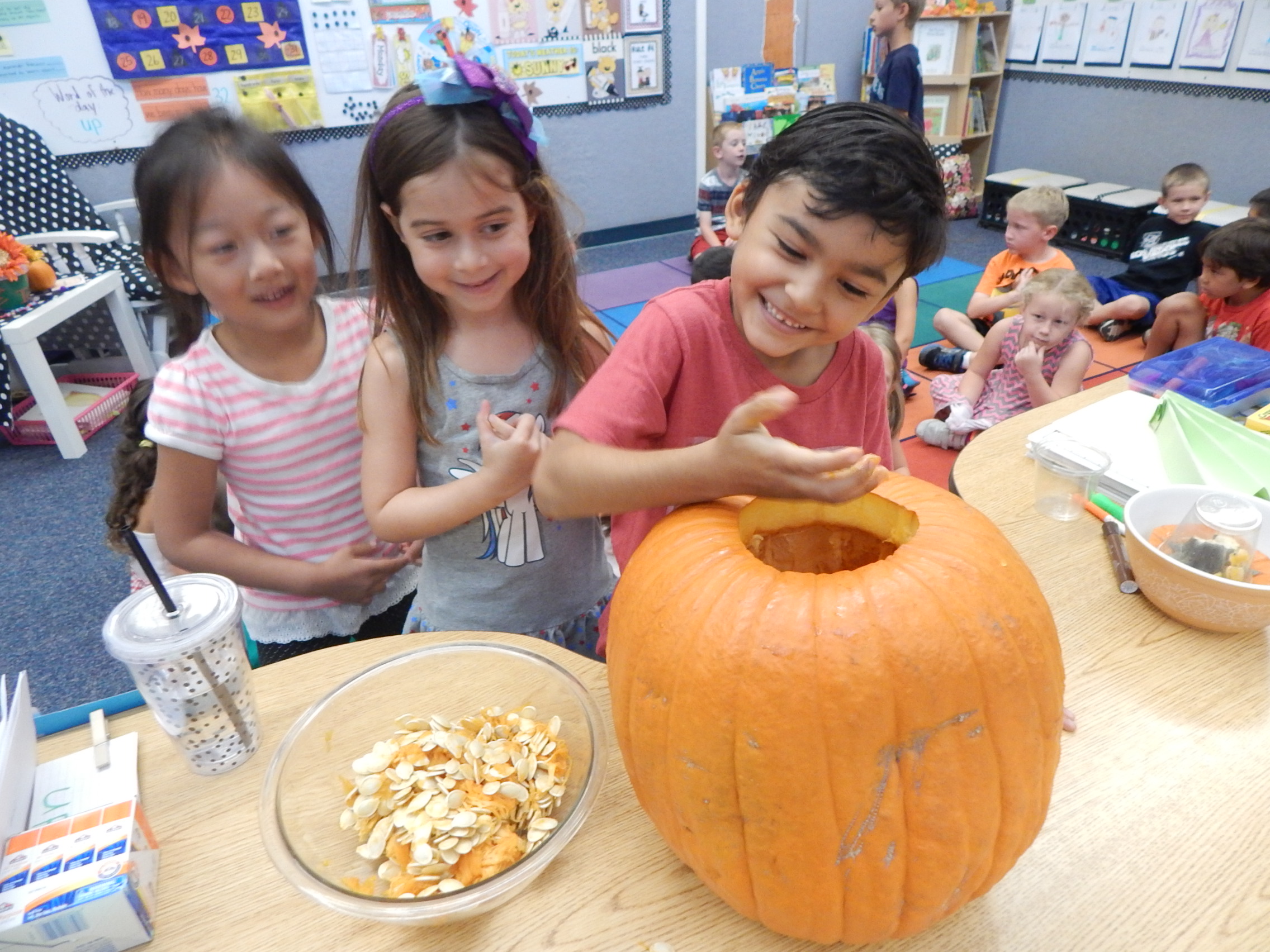 Today we began our exploration of Pumpkin Jack. First we described how he looked on the outside using our senses. Then I carved open the top and allowed the kiddos to put their hands in and scoop out some of the inside. It was super cool, and funny too hearing how they oohed and aahhed at the wet slimey texture of the "guts". They desribed how he felt, looked, and smelled. Next, they estimated how many pumpkin seeds were inside...enjoy looking at their responses! The actual number was 498! On Monday they will get to use their other senses of taste and hearing when they eat baked pumpkin seeds. Every few days we will log in our science journals what Pumpkin Jack looks like and learn about decomposition and how nature works over time. It is always very exciting for the kiddos to see his transformation. Here are a few pictures...Enjoy!