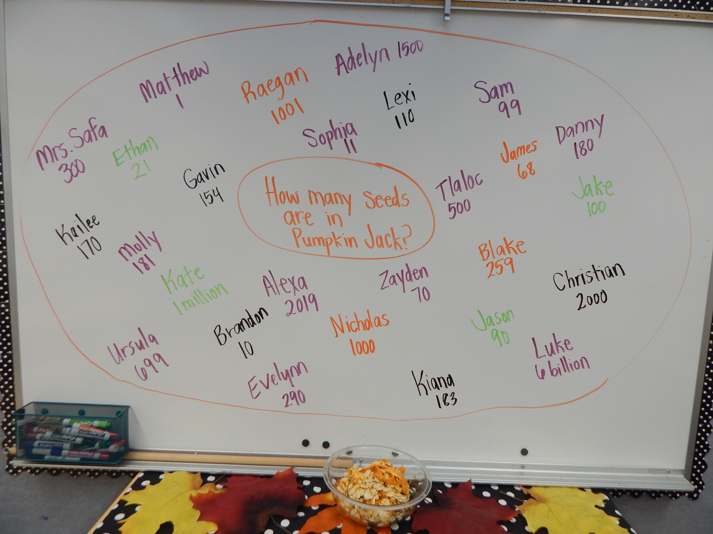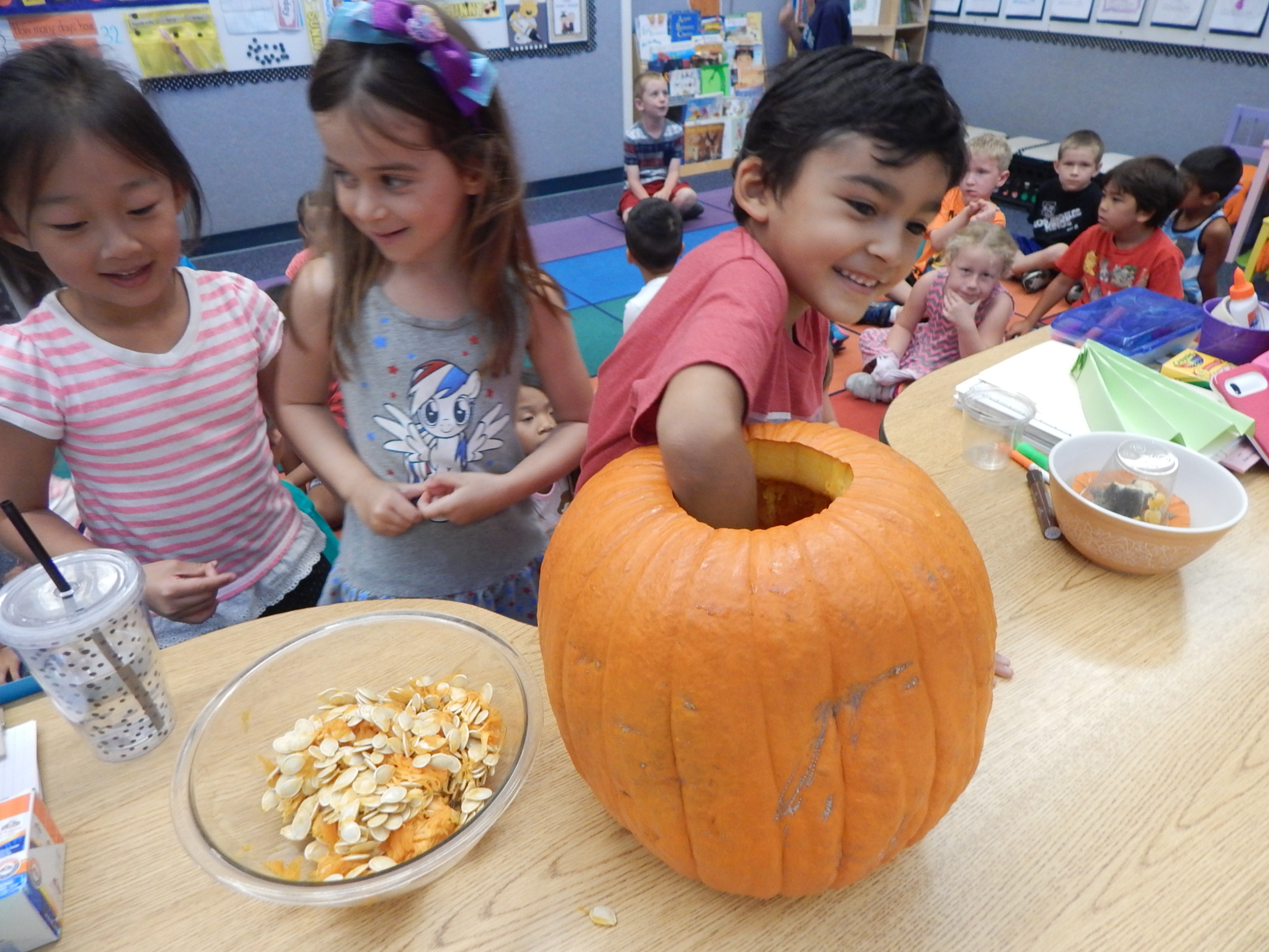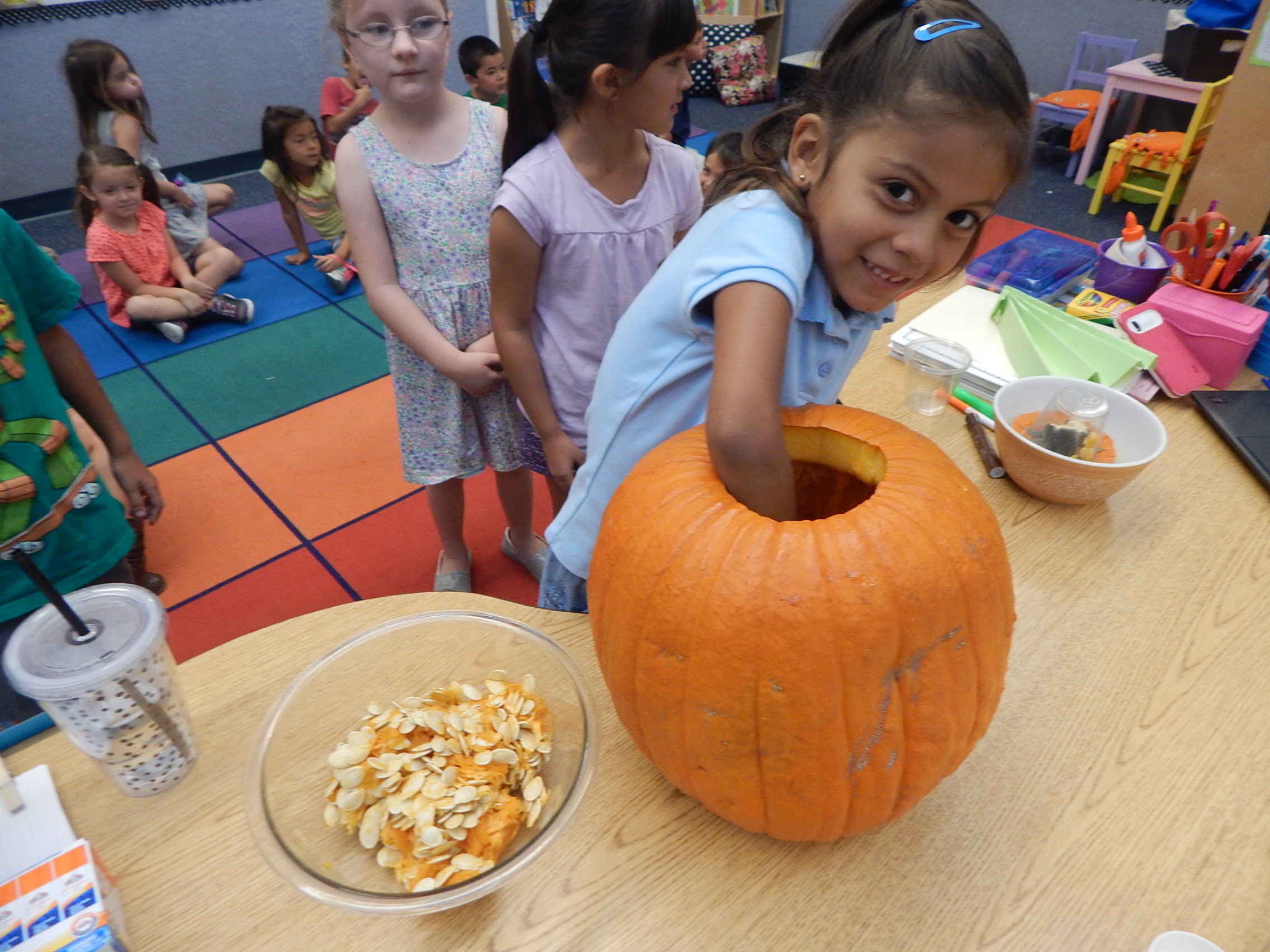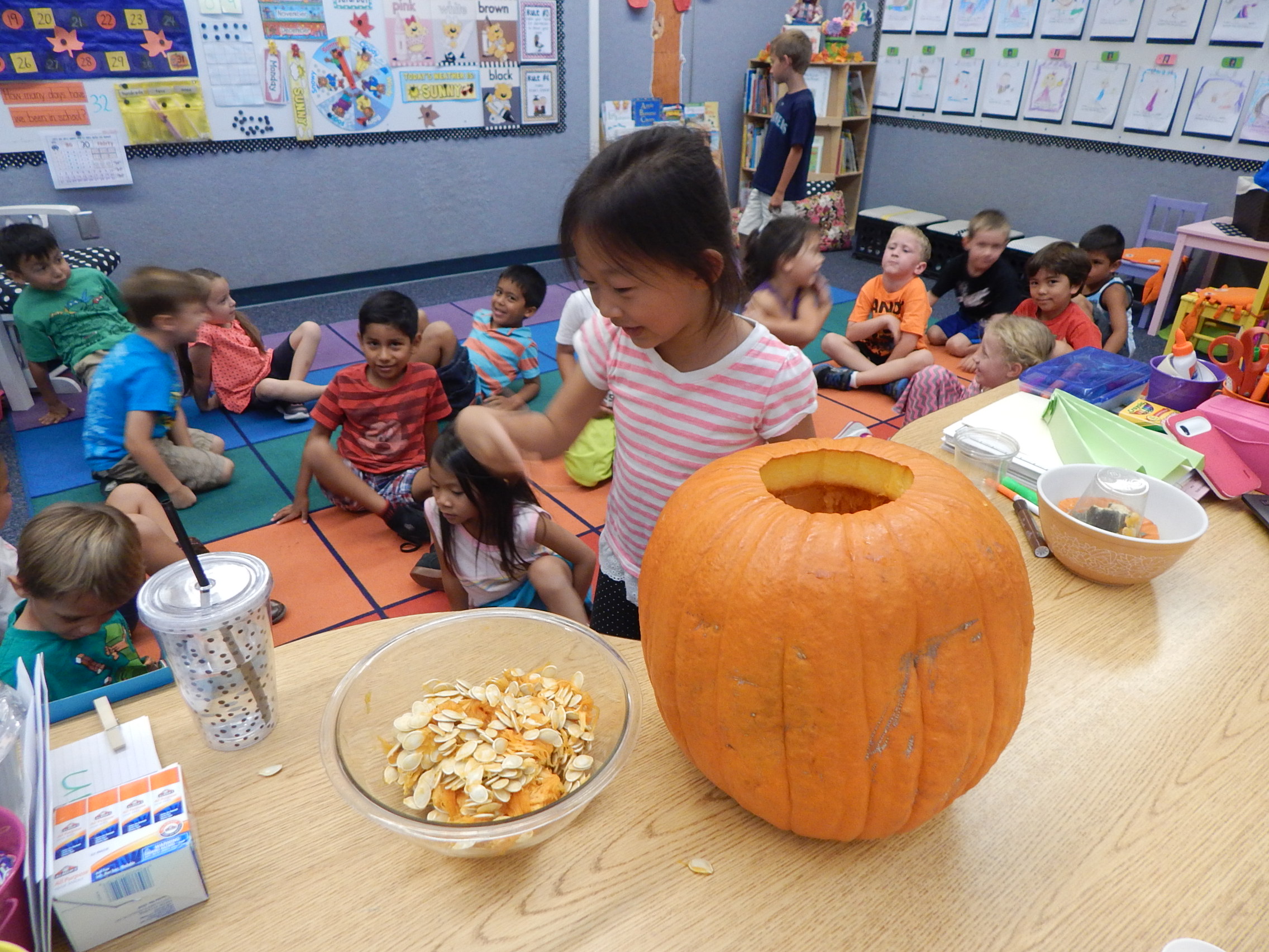 Today we began our exploration of Pumpkin Jack. First we described how he looked on the outside using our senses. Then I carved open the top and allowed the kiddos to put their hands in and scoop out some of the inside. It was super cool, and funny too hearing how they oohed and aahhed at the wet slimey texture of the "guts". They desribed how he felt, looked, and smelled. Next, they estimated how many pumpkin seeds were inside...enjoy looking at their responses! The actual number was 498! On Monday they will get to use their other senses of taste and hearing when they eat baked pumpkin seeds. Every few days we will log in our science journals what Pumpkin Jack looks like and learn about decomposition and how nature works over time. It is always very exciting for the kiddos to see his transformation. Here are a few pictures...Enjoy!