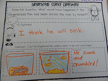 We have been reading many stories about the Gingerbread Man. Today in class, we did an experiment to see what would have happened to the gingerbread man if he hadn't asked the fox to help him swim across the river. The kids had to make a hypothesis as to what they thought would happen. They thought that he would crumbled, sink, or make it across.