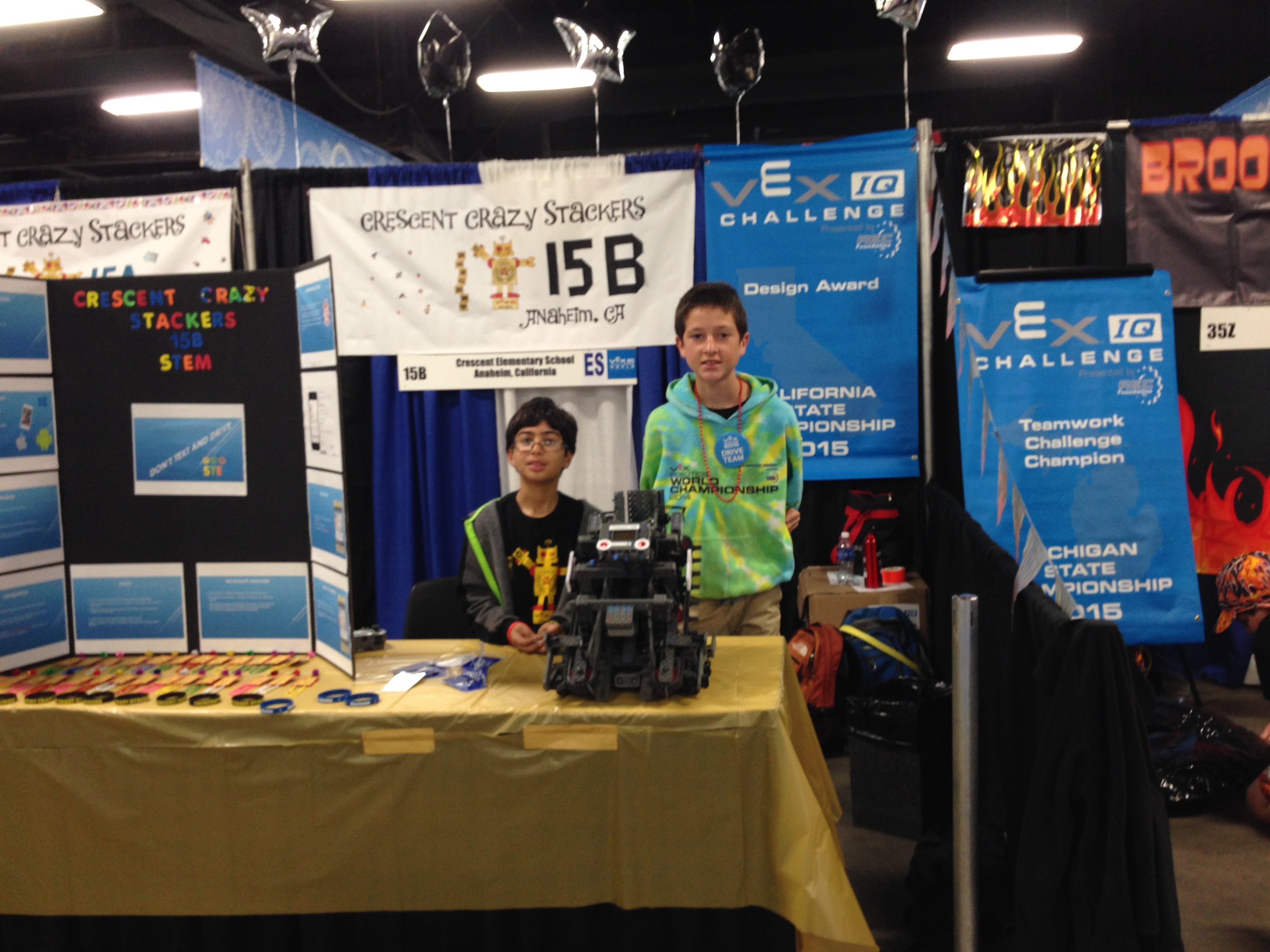 ORANGE, CA — April 23, 2015 — Crescent Elementary School’s Crazy Stackers Robotics Teams A and B did an excellent job at the VEX Worlds 2015 competition in Kentucky this past weekend.