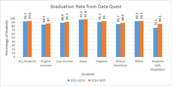 Both Asian and White students grew by 0.3 percentage points over the last two years. The Asian students’ graduation rate was 5.2 percentage points higher than the State rate. The White students’ graduation rate was 5.5 percentage points higher than the State rate.