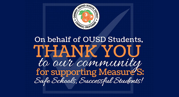 Orange, CA – November 18, 2016 - Orange Unified School District wishes to thank the community for their support of Measure S: Safe Schools, Successful Students. This is the first bond to pass in OUSD, which is the last unified District in Orange County to have a bond approved by voters.