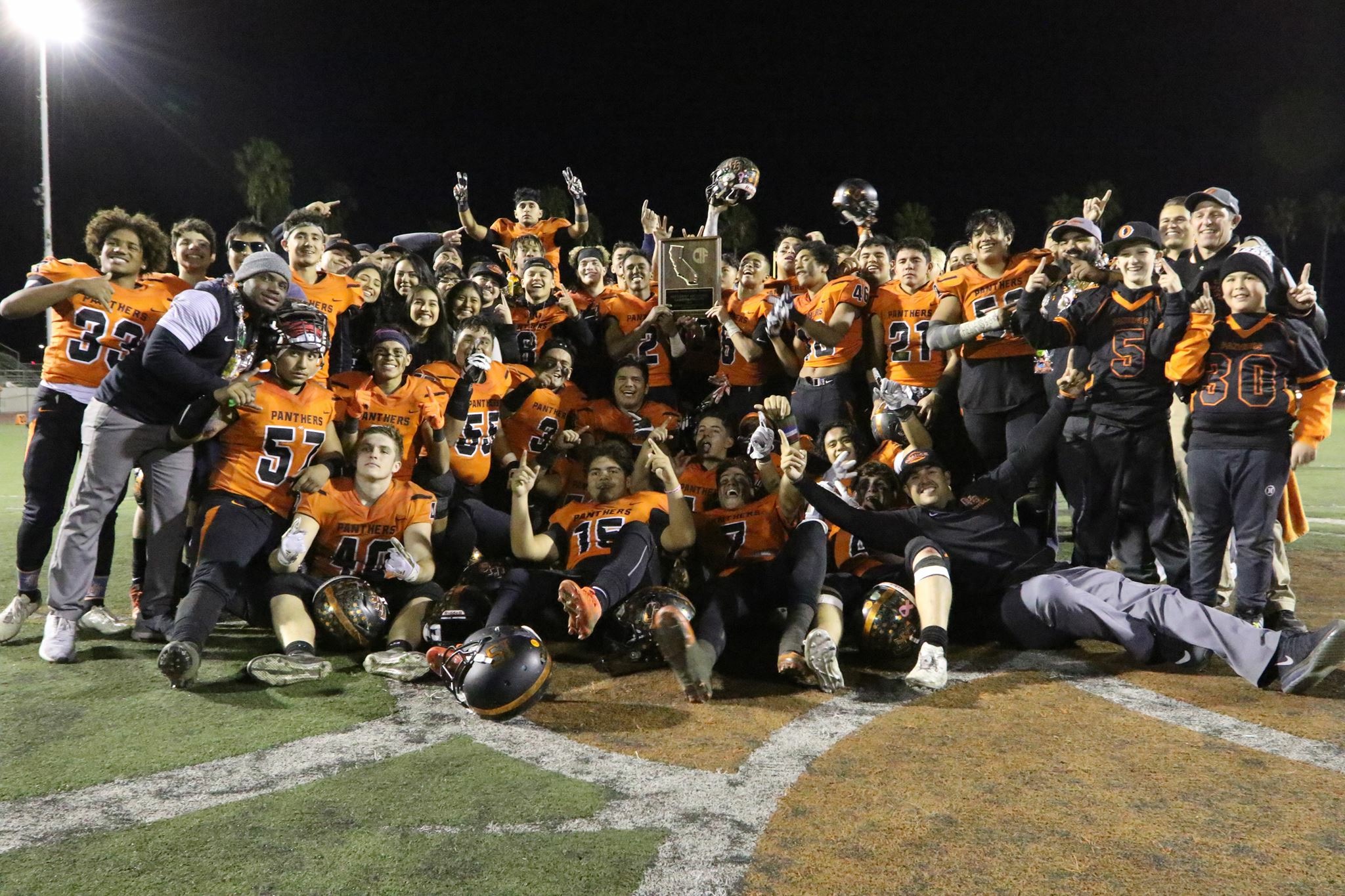 Orange, CA – December 9, 2017 -Orange High School pulled out victory beating Caruthers by 46-43 in overtime on Friday, Dec. 8, 2017 in a CIF Southern California Regional Division 6-AA championship football game at Fred Kelly Stadium. The team was awarded a regional championship football plaque and advanced to the state football championship game. “These kids are so resilient,” said Orange coach Robert Pedroza, who on Thursday was named Los Angeles Chargers’ Orange County coach of the year. “They battle, through all obstacles, it doesn’t matter.” Coach Pedroza said the team is hungry for another game and another championship. “We got one more in us,” he said. “For sure.” For more game information, please click on the following link: http://www.ocregister.com/2017/12/08/orange-pulls-out-victory-in-ot-advances-to-state-div-6-aa-football-championship-game/