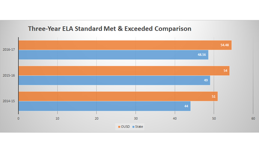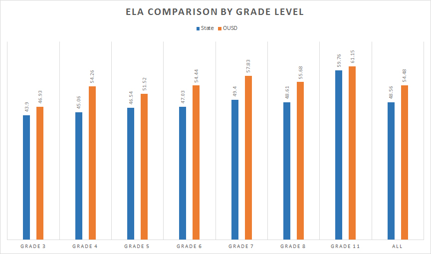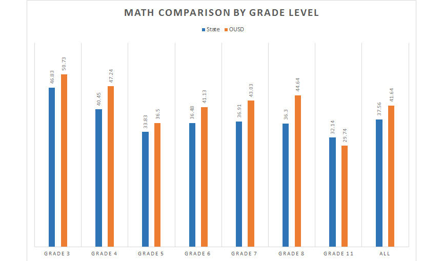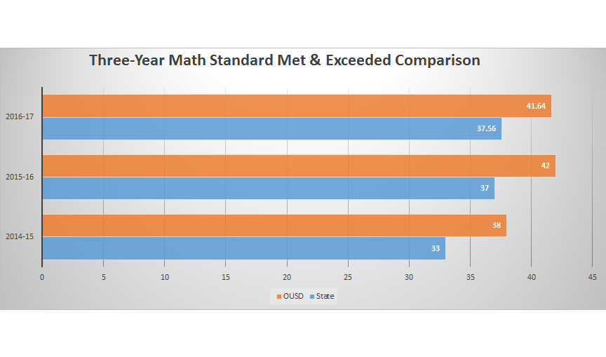 Orange, CA – September 29, 2017 - Orange Unified School District students continue to exceed the statewide percentage of students testing at standard or exceeding standard in English language arts and mathematics on the California Assessment of Student Progress and Performance (CAASPP). This is the third year of the computer adaptive assessment which uses California’s challenging academic standards to ask students to write clearly, think critically, solve complex problems, and complete performance tasks just as they will need to do in college and 21st century careers. In Orange USD, fifty-four percent of students met or exceeded standard in English language arts, which surpasses the state percentage by five percent. In addition, forty-two percent of OUSD students met or exceeded standards in math, which is higher than the state percentage by four percent, according to newly released scores.